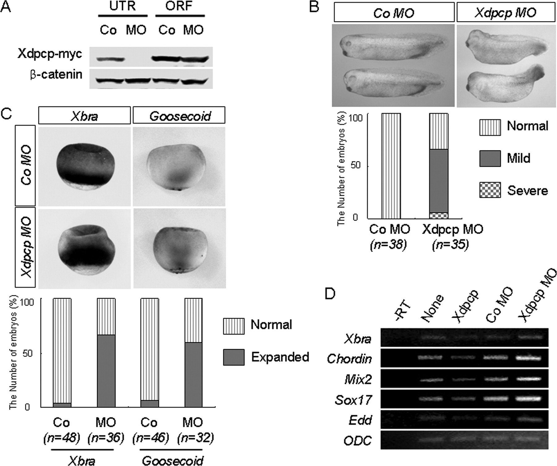 xdpcp knockdown leads to expansion of mesodermal territory. A, the efficacy and targeting specificity of xdpcp MO. Co, control morpholino; MO, xdpcp MO; ORF, Myc-tagged xdpcp RNA without morpholino targeting sites; UTR, Myc-tagged xdpcp RNA with morpholino targeting sites. β-Catenin serves as loading control. B, compared with control (100% normal, n = 38), xdpcp knockdown embryos showed dorso-anteriorized phenotype (6% severe, 60% mild, 34% normal, n = 35). The embryos were injected with Co MO (40 ng) or xdpcp MO (40 ng) into the dorso-animal regions of 4-cell stage, and then cultured to the stage 34. The graph shows the percentage of the number of embryos with each phenotype. n, total number of embryos analyzed. C, loss-of-Xdpcp function affects on the expression of endogenous mesodermal markers such as xbra and goosecoid. Compared with control (Xbra: 4% expanded, 96% normal, n = 48; goosecoid: 7% expanded, 93% normal, n = 46), Xdpcp depletion leads to expansion of these markers (xbra: 67% expanded, 33% normal, n = 36; goosecoid: 59% expanded, 41% normal, n = 32). The embryos were injected with Co MO (40 ng) or xdpcp MO (40 ng) into the dorso-animal regions at the 4-cell stage, cultured until stage 10.5, and then provided for in situ hybridization. The graph shows the percentage of the number of embryos with each phenotype. n, the total number of embryos analyzed. D, RT-PCR analysis showing that Xdpcp inhibits the endogenous expression of mesendodermal markers. The amount of injected reagents is as follows: xdpcp, 2 ng; Co MO, 80 ng; xdpcp MO, 80 ng. Ornithine decarboxylase (ODC) serves as a loading control.