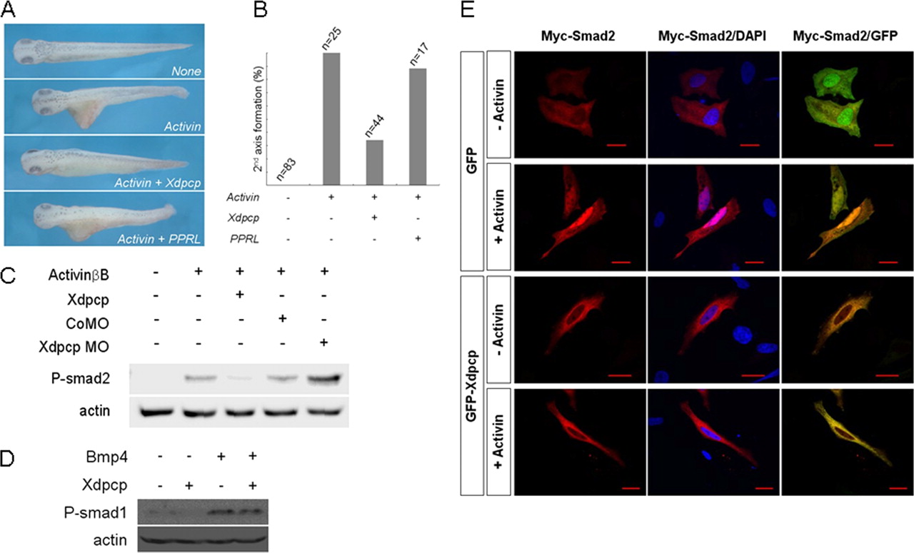 Xdpcp inhibits activin/nodal signaling. A, the secondary axis formation by ectopic expression of activin RNA is rescued by coexpression of xdpcp RNA. Xenopus 4-cell stage embryos were injected with the indicated RNAs into the ventral regions, and then cultured until stage 35. The amount of injected RNAs is as follows: activin-βB, 2.5 pg; xdpcp, 2 ng; preprolactin (PPRL), 2 ng. B, the graph showing the results from the axis duplication assay. C, Smad2 phosphorylation induced by activin was reduced by coexpression of xdpcp, whereas Xdpcp depletion by using MO increases phosphorylation of Smad2. The amount of injected reagents is as follows: activin-βB RNA, 5 pg; xdpcp RNA, 2 ng; CoMO, 40 ng; xdpcp MO, 40 ng. Actin serves as a loading control. D, Xdpcp does not inhibit the phosphorylation of Smad1, an effector of Bmp signaling. Animal cap tissues injected with bmp4 RNA (200 pg) and xdpcp RNA (2 ng) as indicated were subjected to immunoblotting analysis with phospho-Smad1 antibody. E, Xdpcp inhibits nuclear translocation of Smad2 in HeLa cells. HeLa cells were transfected with Myc-tagged Smad2 in combinations with GFP or GFP-tagged Xdpcp, treated with activin protein (50 ng/ml) for 10 min after 36 h of transfection, fixed with 4% paraformaldehyde, and then subjected to the immunostaining analysis with anti-Myc antibody to detect localization of Smad2.