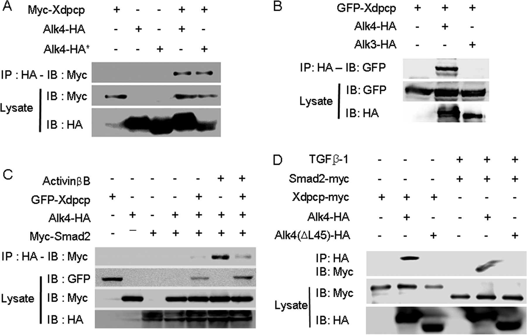 Xdpcp inhibits the interaction between activin receptor and Smad2. A, Xdpcp interacts with type I activin receptor, Alk4. Xenopus embryo lysates injected with combinations of Myc-tagged xdpcp RNA (1 ng) and HA-tagged Alk4 RNA (1 ng) as indicated were immunoprecipitated with anti-HA antibody and then subjected to immunoblotting (IB) analysis. Asterisk represents the constitutively active form of Alk4. B, Xdpcp does not bind to Alk3, the Bmp receptor. HEK293FT cell lysates transfected with combinations of the indicated expression plasmids for GFP-tagged Xdpcp, HA-tagged Alk4, and HA-tagged Alk3 protein were immunoprecipitated with anti-HA antibody, and subsequently subjected to immunoblotting analysis with anti-GFP antibody to detect their association. C, the association between Alk4 and Smad2 is inhibited by coexpression of xdpcp in Xenopus embryos. The amount of injected reagents is as follows: activin-βB, 5 pg; GFP-tagged Xdpcp, 2 ng; HA-tagged Alk4, 1 ng; Myc-tagged Smad2, 1 ng. D, the L45 region of Alk4 is required for binding to Xdpcp. The cells expressing the indicated reagents were subjected to immunoprecipitation (IP) and Western blot analysis after a 1-h TGF-β treatment.