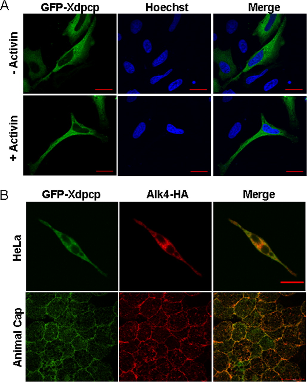 The subcellular localization of Xdpcp. A, Xdpcp is localized at the cytoplasm, but not nucleus in HeLa cells. HeLa cells were transfected with GFP-tagged Xdpcp, treated with or without activin protein (50 ng/ml) for 10 min after 36 h of transfection. B, Xdpcp is co-localized with Alk4 in both HeLa cells (top) and Xenopus animal cap cells (bottom). Scale bars are 20 (HeLa cells) and 50 μm (animal cap cells).