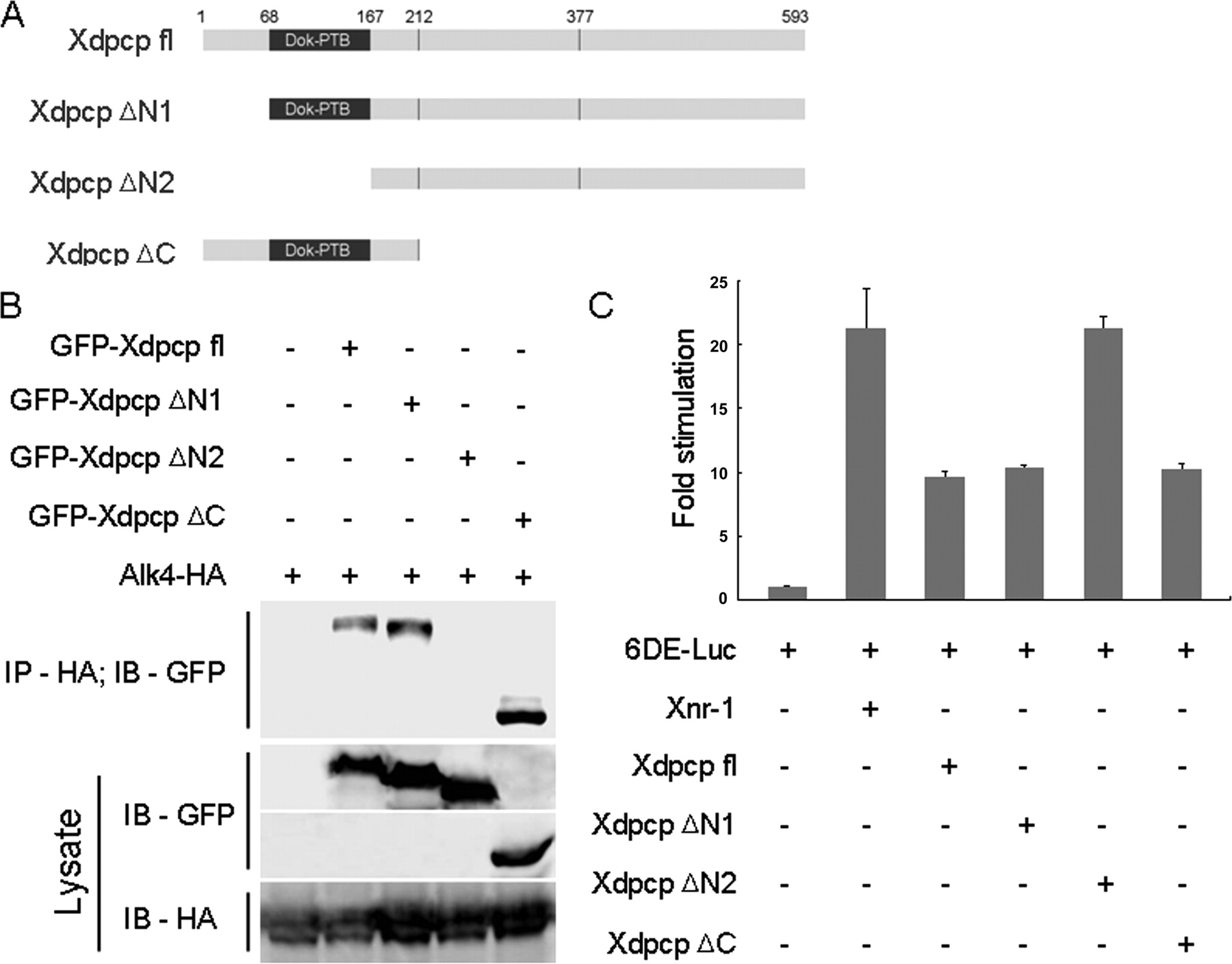 PTB domain of Xdpcp is essential for interaction with Alk4. A, mapping of deletion mutants. B, HEK293FT cells were transfected with HA-tagged Alk4 alone or in combination with each deletion mutant as indicated. Cell lysates were immunoprecipitated (IP) with anti-HA antibody, followed by immunoblotting (IB) with anti-GFP antibody to observe their association. C, luciferase assays in Xenopus embryos injected with combinations of the indicated reagents. The amount of injected reagents is as follows: xnr-1 RNA, 100 pg; RNAs of Xdpcp full-length and deletion mutants, 2 ng; 6DE-Luc reporter DNA, 40 pg. Error bars represent the standard deviation.