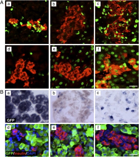 Fig. 2. Aggregation of pre existing β-cells give rise to bigger islets at the end of climax. (Aaâc) β-cell proliferation at different stages of metamorphosis. BrdU was injected intraperitoneally into staged animals every other day for 10 days and pancreases were collected on the 11th day from (a) NF55 tadpoles; (b) climax (NF59âNF66) and (c) growing froglets. BrdU (green) and insulin (red) were detected by antibodies. Cell cycle activity monitored by immunostaining with a PCNA antibody (green) and insulin (red). (d) NF55 tadpoles; (e) climax (NF59âNF66) and (f) growing froglets. (B) pElastase-GFP transgenic animal. (aâc) in situ hybridization of GFP mRNA; (dâf) immunohistochemistry for GFP (green) and insulin (red). (a, d) NF55; (b, e) NF62; (c, f) NF66. Scale bar 40 μm.