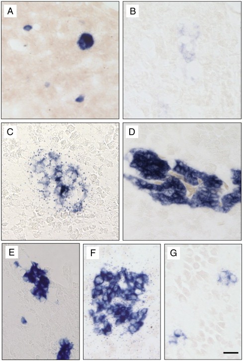 Fig. 4. Insulin mRNA in situ hybridization of control and transgenic pancreases at varying stages. These reactions were carried out together and developed for the same time. (A) Control premetamorphic pancreas has small islets that stain for insulin mRNA with similar intensity as (D) adult islet cells. (B) At NF62 most of the insulin mRNA is down regulated and reexpression begins at (C) the end of climax NF66. The pInsulin-TRDN transgenic pancreas does not down regulate insulin mRNA at (E) NF62 or (F) NF66, but its ability to aggregate by NF66 is not impaired. (G) pElastase-TRDN-GFP at NF66 showed similar insulin mRNA down regulation as that of wild-type but the β-cells do not aggregate. Scale bar equals 40 μm.