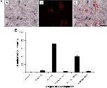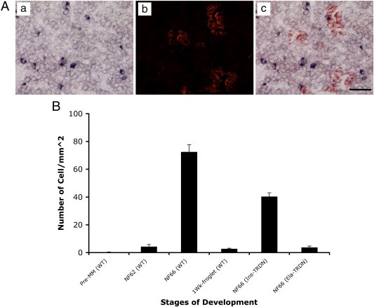 Fig. 5. Screening of progenitor cell markers revealed the existence of (A) ngn-3 positive cells at metamorphic climax. (a) Ngn-3 in situ at NF66; (b) insulin immunohistochemistry on the same section and (c) merger of a and b. Ngn3 cells never co localize with insulin staining cells. (B) Quantitative estimation of ngn3 positive cells at different developmental stages of control and the two different strains of transgenic animals. Scale bar equals 40 μm.