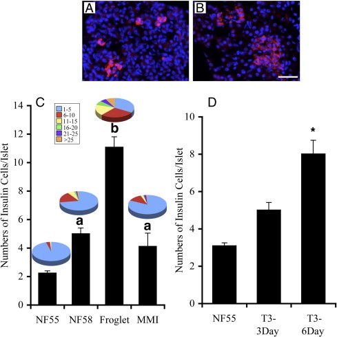 Fig. 1. Clustering of β-cells during spontaneous and T3-induced metamorphosis of X. laevis. (A) premetamorphic tadpoles (NF54); (B) froglet (NF66). A and B panels are stained with an insulin antibody (red) and DAPI (blue). (C) Average number of insulin cells per islet increases as the animal proceeds to metamorphosis. The pie-diagram above each bar represents the distribution of the different sized clusters marked with different colors as described in the insert. For example the blue color represents the fraction of total islets that consist of 1â5 β-cells. (a) The average cluster sizes at prometamorphosis and in the methimazole arrested animals is significantly higher (p < 0.05) than that of premetamorphic stages. Rearing tadpoles in methimazole (MMI) inhibits TH-induced changes including enlargement of islets. (b) The cluster size in froglets is larger than any of the tadpole islet sizes. (D) Exogenous triiodothyronine (T3) induces an increase in β-cell cluster size in premetamorphic tadpoles. Premetamorphic tadpoles were exposed to 10 nM T3 in rearing water and the insulin cluster sizes were calculated at 3 and 6-day of exposure and compared with the cluster size of control animals. There was a significant increase in cluster size on the 6th day of T3 treatment (p < 0.05). Scale bar (A and B) 20 μm.