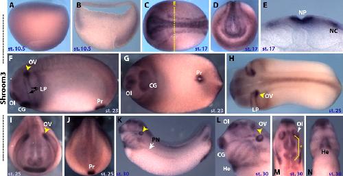 Figure 6. Expression pattern of Shroom3 in Xenopus. A,B: Stage 10.5. A: Lateral view, animal to the top. B: Sagittal-section view, animal to the top. C-E: Stage 17. C: Dorsal view, anterior to the left. D: Anterior view, dorsal to the top. E: Transverse cross-section. NP, neural plate; NC, neural crest. Dorsal to the top. The sectioning level is indicated by yellow dotted line in C. F,G: Stage 23. F: Lateral view, dorsal to the top. OV, otic vesicle; LP, lateral line placode; Ol, olfactory placode; CG, cement gland; Pr, Proctodeum. G: Ventral view, anterior to the left. H-J: Stage 25. H: Dorsal view, anterior to the left. I: Anterior view, dorsal to the top. J: Posterior view, dorsal to the top. K,L Stage 30. K: Lateral view, anterior to the left, dorsal to the top. L-N: Head views of K. L: Lateral view, anterior to the left, dorsal to the top. M: Dorsal view, anterior to the top. PN, prenephric tubes and duct. Yellow star indicates the brain. N: Ventral view, anterior to the top. He, heart.