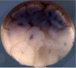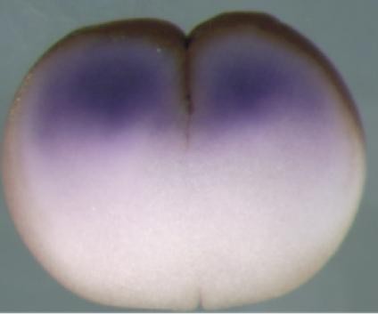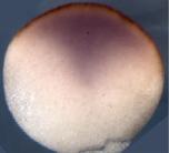 shroom1 ( shroom family member 1 ) gene expression in Xenopus laevis embryos, NF stage2, as assayed by in situ hybridization. Animal up, vegetal down.