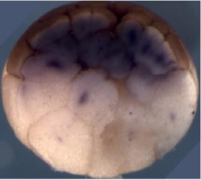 shroom1 ( shroom family member 1 ) gene expression in Xenopus laevis unfertilized eggs, as assayed by in situ hybridization. Animal up, vegetal down.