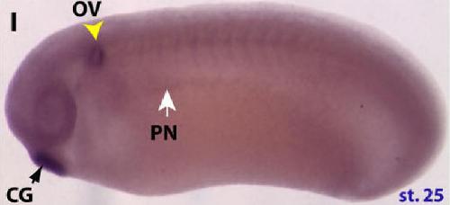 Figure 3. Expression pattern of Shroom1 in Xenopus. A: Lateral view of stage 10.5, animal to the top. B-D: Stage 17. B: Dorsal view, anterior to the left. C: Lateral view, anterior to the left, dorsal to the top. D: Transverse cross-section view. So, somite; Noto, notochord. Dorsal to the top. The sectioning level is indicated by yellow dotted line in C. E-G: Stage 22. E: Lateral view, anterior to the left, dorsal to the top. CG, cement gland. F: Dorsal view of anterior region, anterior to the left. OV, otic vesicle. G: Cement gland, dorsal to the top. H,I: Stage 25. H: Cement gland, dorsal to the top. I: Lateral view, anterior to the left, dorsal to the top. PN, prenephric tubes and duct. J,K: Stage 30. J: Lateral view, anterior to the left, dorsal to the top. K: High-magnification view of anterior region. Yellow arrowheads indicate the otic vesicle (OV) and white arrows indicate the prenephric tubes and duct (PN).