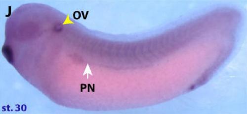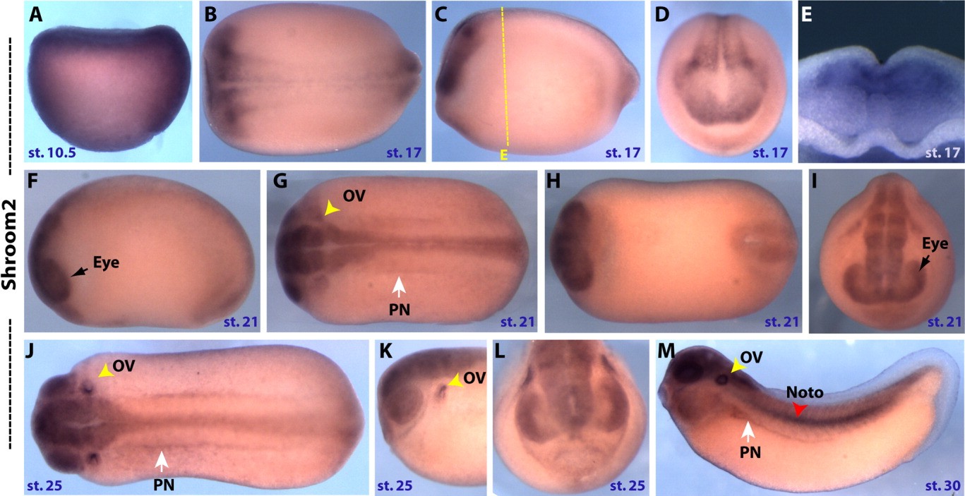 Figure 5. Expression pattern of Shroom2 in Xenopus. A: Stage 10.5, lateral view, animal to the top. B-E: Stage 17. B: Dorsal view, anterior to the left. C: Lateral view, anterior to the left, dorsal to the top. D: Anterior view, dorsal to the top. E: Transverse cross-section view, dorsal to the top. The sectioning level is indicated by yellow dotted line in C. F-I: Stage 21. F: Lateral view, anterior to the left, dorsal to the top. G: Dorsal view, anterior to the left. OV, otic vesicle; PN, prenephric tubes and duct. H: Ventral view, anterior to the left. I: Anterior view, dorsal to the top. J-L: Stage 25. J: Dorsal view, anterior to the left. K: Lateral view of anterior region, dorsal to the top. L: Anterior view, dorsal to the top. M: Stage 30, lateral view, anterior to the left, dorsal to the top. Noto, notochord. Yellow arrowheads indicate the otic vesicle (OV), white arrows indicate the prenephric tubes and duct (PN) and red arrowhead indicates the notochord (Noto).