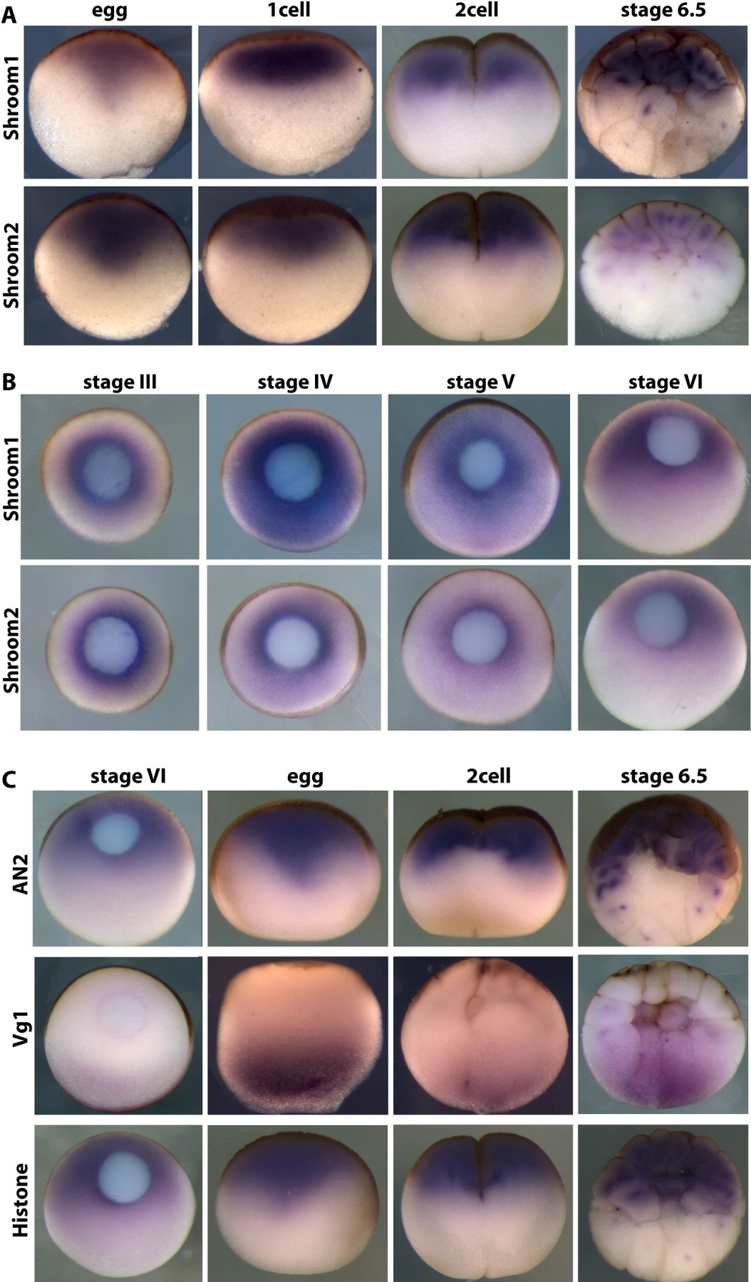 Figure 2. mRNA localization of Shroom1 and 2 during oogenesis and early development. A: In situ hybridization against Shroom1 and 2 in unfertilized egg, 1-cell, 2-cell stage, and stage 6.5. B: In situ hybridization against Shroom1 and 2 during oogenesis. C: In situ hybridization against AN2*, Vg1, and Histone H3. Animal to the top in all panels.