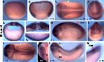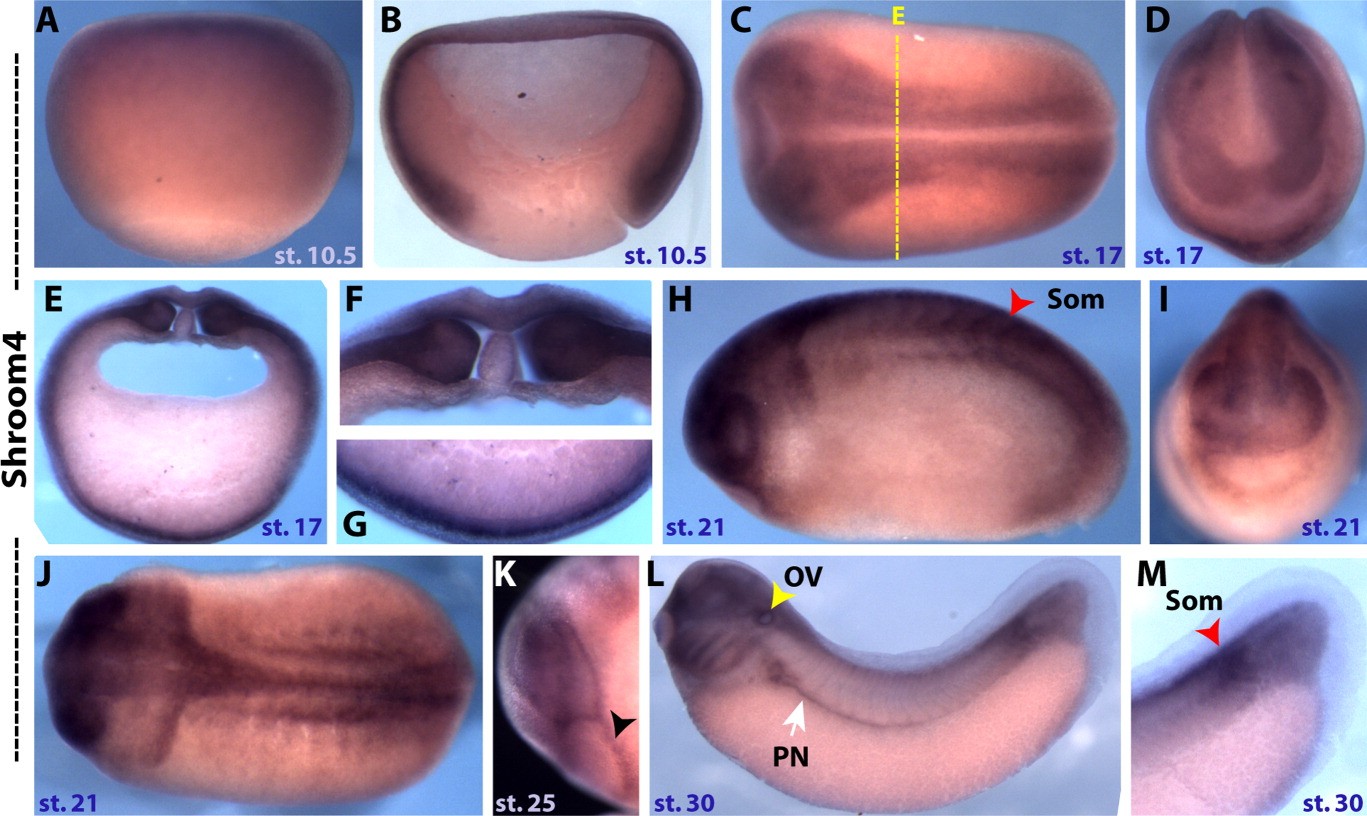 Figure 7. Expression pattern of Shroom4 in Xenopus. A,B: Stage 10.5. A: Dorsal view, animal to the top. B: Sagittal-section view, animal to the top. C-G: Stage 17. C: Dorsal view, anterior to left. D: Anterior view, dorsal to top. E: Transverse cross-section view, dorsal to the top. The sectioning level is indicated by yellow dotted line in C. F,G: Dorsal part.(F) and ventral part (G) of E, dorsal to the top. H-K: Stage 21. H: Lateral view, anterior to the left, dorsal to the top. Som, somite. I: Anterior view, dorsal to the top. J: Dorsal view, anterior to the left. K: Lateral view of most anterior region, dorsal to the top. Black arrowhead indicates the boundary cells of the cement gland. L,M: Stage 30. L: Lateral view, anterior to the left, dorsal to the top. OV, otic vesicle; PN, prenephric tubes and duct. M: Most posterior region of L. Red arrowhead indicates the most posterior of somatic region.