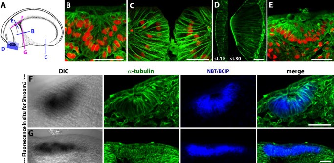 Figure 8. Cell shapes in Shroom-expressing tissues. A: Schematic depicting the sections of embryo imaged for B through G. B: Lateral line placode. C: Proctodeum. D: Cement gland (phalloidin). E: Otic vesicle. green is α-tubulin, red is propidium iodide in B, C, E. Green is phalloidin in D. F,G: Fluorescence images of in situ hybridization against Shroom3. DIC, Differential interference contrast image; α-tubulin, image stained with α-tubulin antibody; NBT/BCIP, NBT/BCIT precipitate following in situ hybridization by Shroom3 probe. It was detected by confocal microscopy. F: Otic vesicle. G: Lateral line placode. Scale bar = 50 μm.