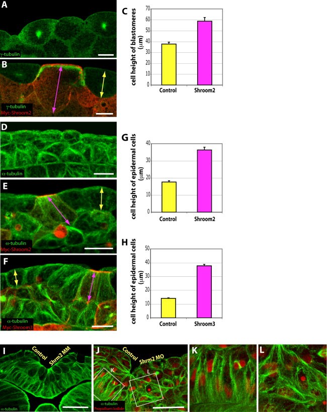 Figure 9. Shroom proteins control cell heightening. AâC: Ectopic Shroom2 induces cell heightening in naive epithelial cells. A: Control. B: Shroom2-expressing cell. Green, γ-tubulin; red, myc-Shroom2). C: Graph of apicobasal cell height of control and Shroom2-expressing cells (mean ± s.e.m.; ctl, n = 16; Shroom2, n = 15). DâH: Ectopic Shroom2 expression induces cell heightening in epidermal cells. D: Control. E: Shroom2-expressing epidermis. F: Shroom3-expressing epidermis. Green, α-tubulin; red, myc-tagged Shroom2 or 3. G: Graph of apicobasal cell height in Shroom2-expressing epidermal cells (mean ± s.e.m.; ctl, n = 25;Shroom2, n = 25). H: Graph of apicobasal cell height in Shroom3-expressing epidermal cells (mean ± s.e.m : ctl, n = 39;Shroom3, n = 40). Scale bar = 20 μm. Yellow arrow bars are showing the way to measure the cell height for control cells (neighboring cells) and pink arrow bars are showing that for Shroom-expressing cells. I,L: Loss of function assay for Shroom2 in neural plate. Transverse cross-section view of neural plate. Green, α-tubulin; red, propidium iodide. I: One side-Shroom2 mismatched morpholino (MM)-injected embryo. J: One side-Shroom2 morpholino (MO)-injected embryo. The high-magnification views of control side cells (K) and Shroom2 MO-injected side cells (L). Scale bar = 50 μm.