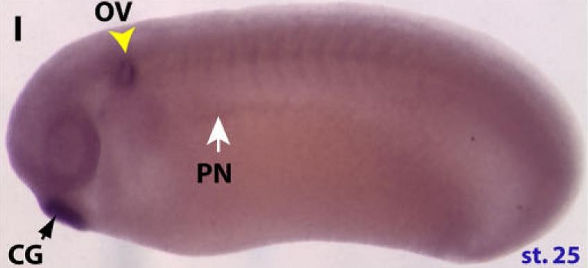 shroom1 ( shroom family member 1 ) gene expression in Xenopus laevis embryos, NF stage25, as assayed by in situ hybridization. Lateral view: Dorsal up, anterior left.