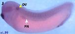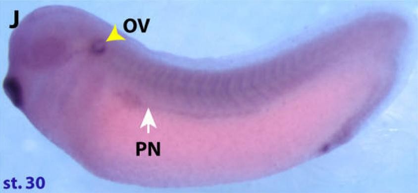 shroom1 ( shroom family member 1 ) gene expression in Xenopus laevis embryos, NF stage30, as assayed by in situ hybridization. Lateral view: Dorsal up, anterior left.