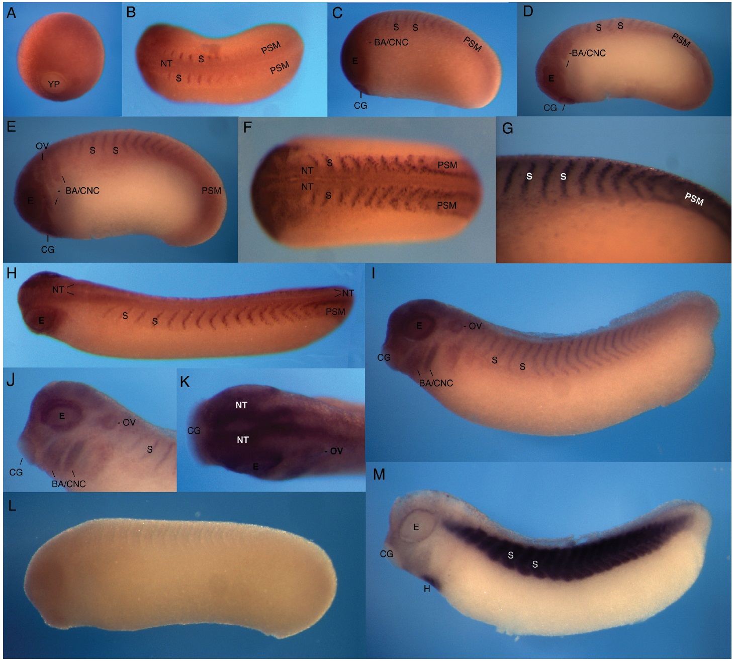 E, eye; H, heart; NT, neural tube; OV, otic vesicle; PSM, pre-somitic mesoderm; S, somite; YP, yolk plug.