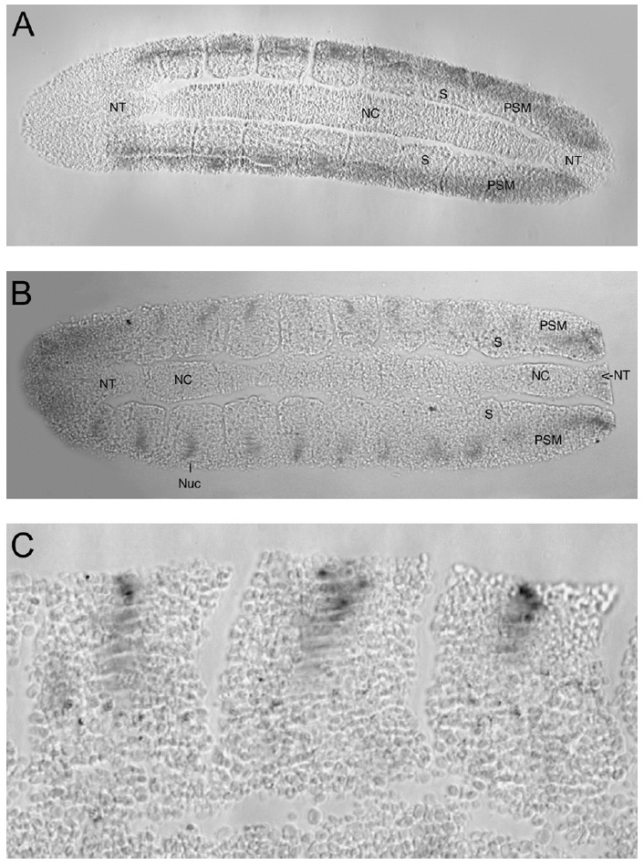 notochord; NT, neural tube; Nuc, nuclei of somite; PSM, presomitic