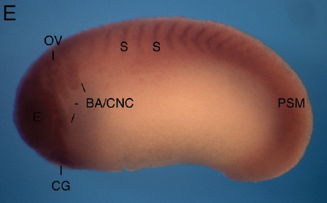 Stage 20, dorsal view. (C) Stage 20, lateral view, showing mandibular, hyoid and branchial neural crest cells, anterior to posterior. (D) Stage