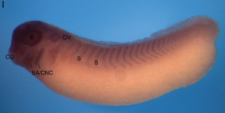 (M) Stage 30 embryo hybridized to the actin probe. BA/CNC, branchial arch region and cranial neural crest segments; CG, cement gland;