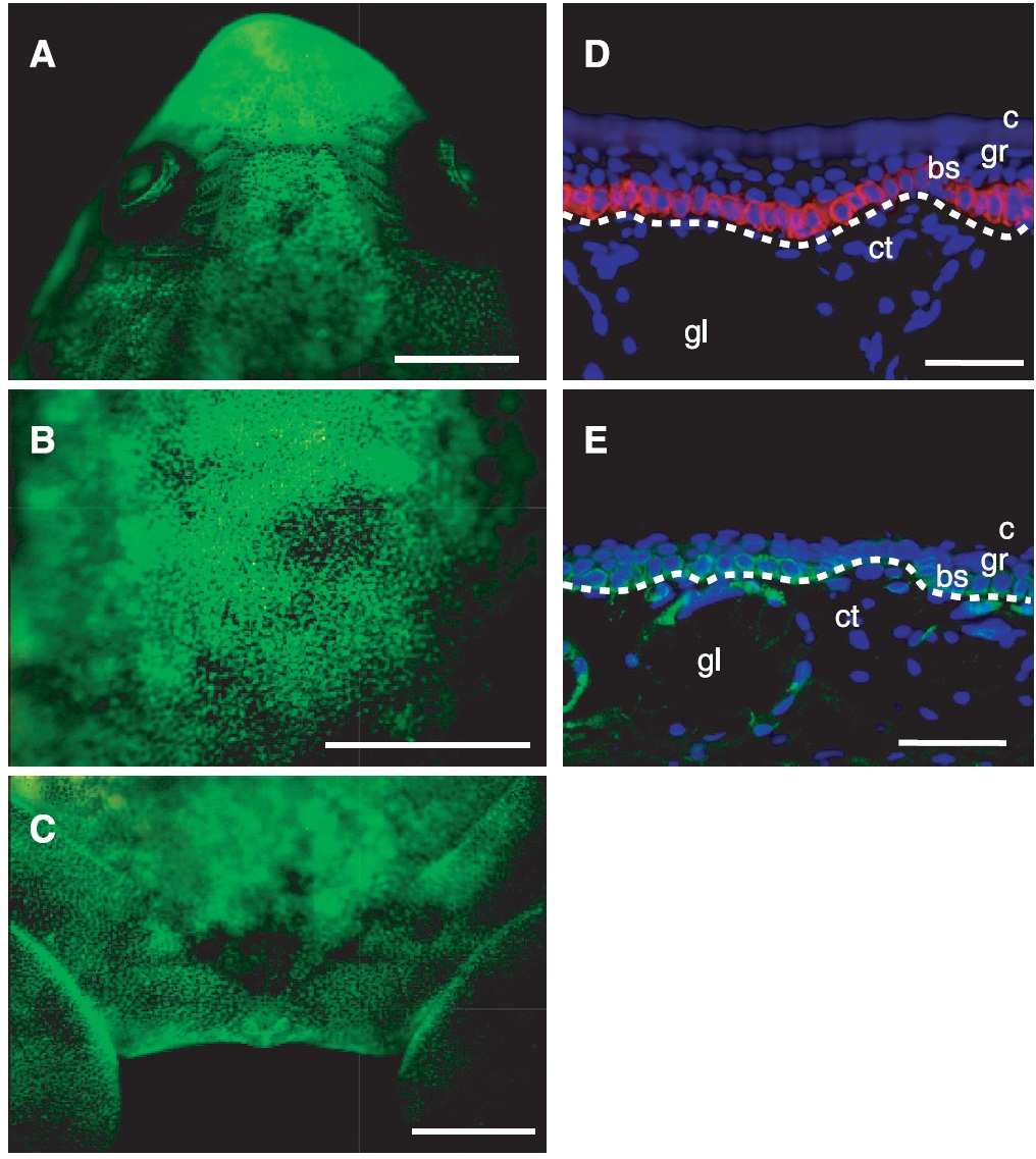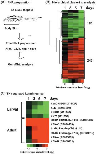 those that had been already accepted as the TH-regulated genes (A) and seven genes as those that had been used as epidermal marker genes (B). The changes of mRNA expression of