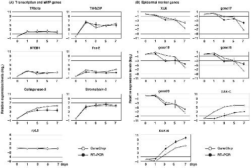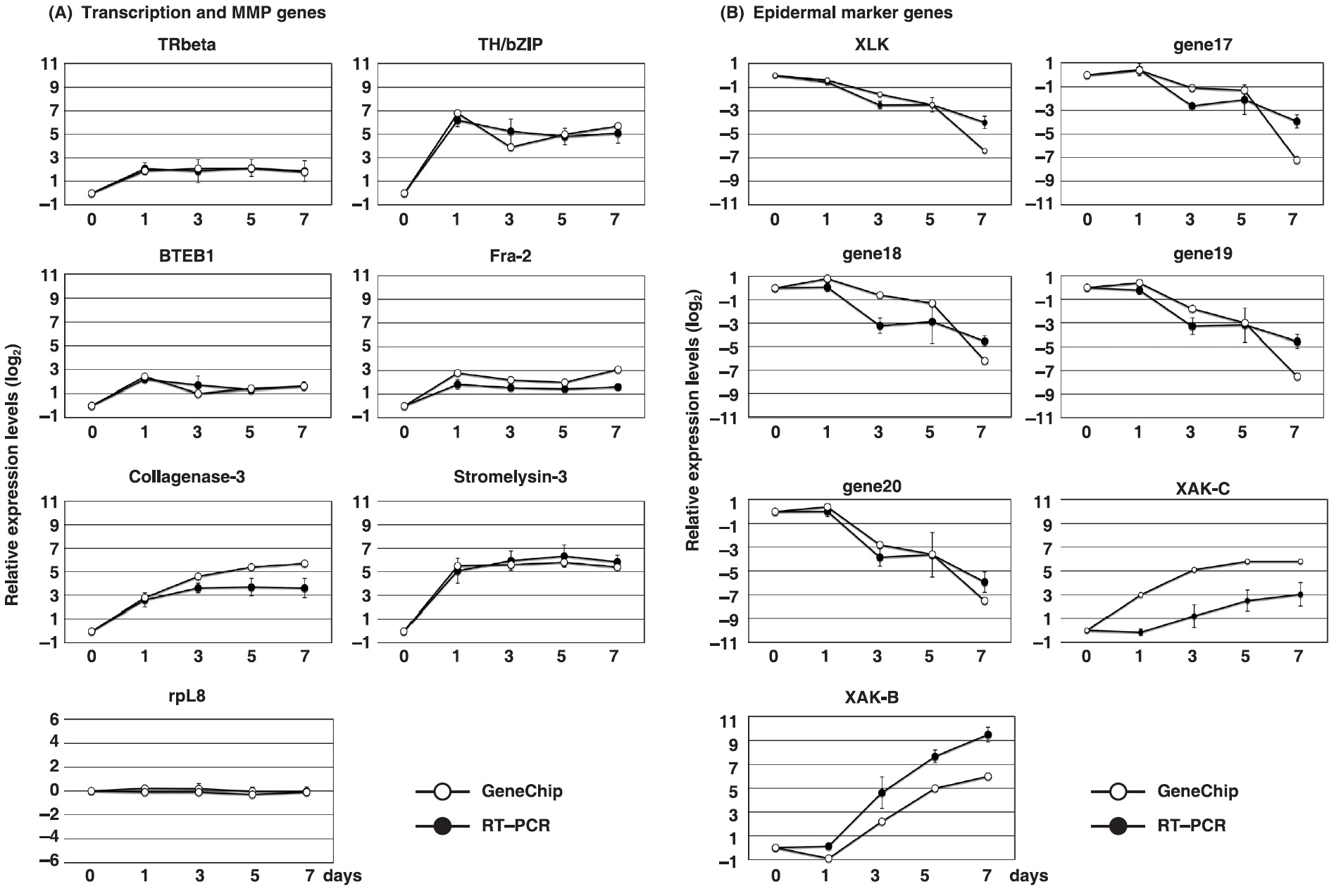 extracted from body skins at the indicated times. Open and closed circles represent the results of GeneChip analysis and real-time RTâPCR, respectively. rpL8 gene was used as an internal