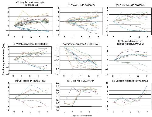 genes), and defense response (GO:6952, five genes). The change in the expression level of each gene is individually depicted by a line that
