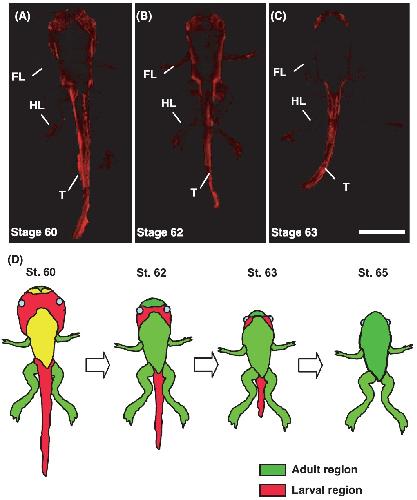 these 14 genes were measured during TH-induced metamorphosis by RTâPCR. Pre-metamorphic stage tadpoles (stage 54/55) were treated with T3 for 7 days. Total RNA samples were