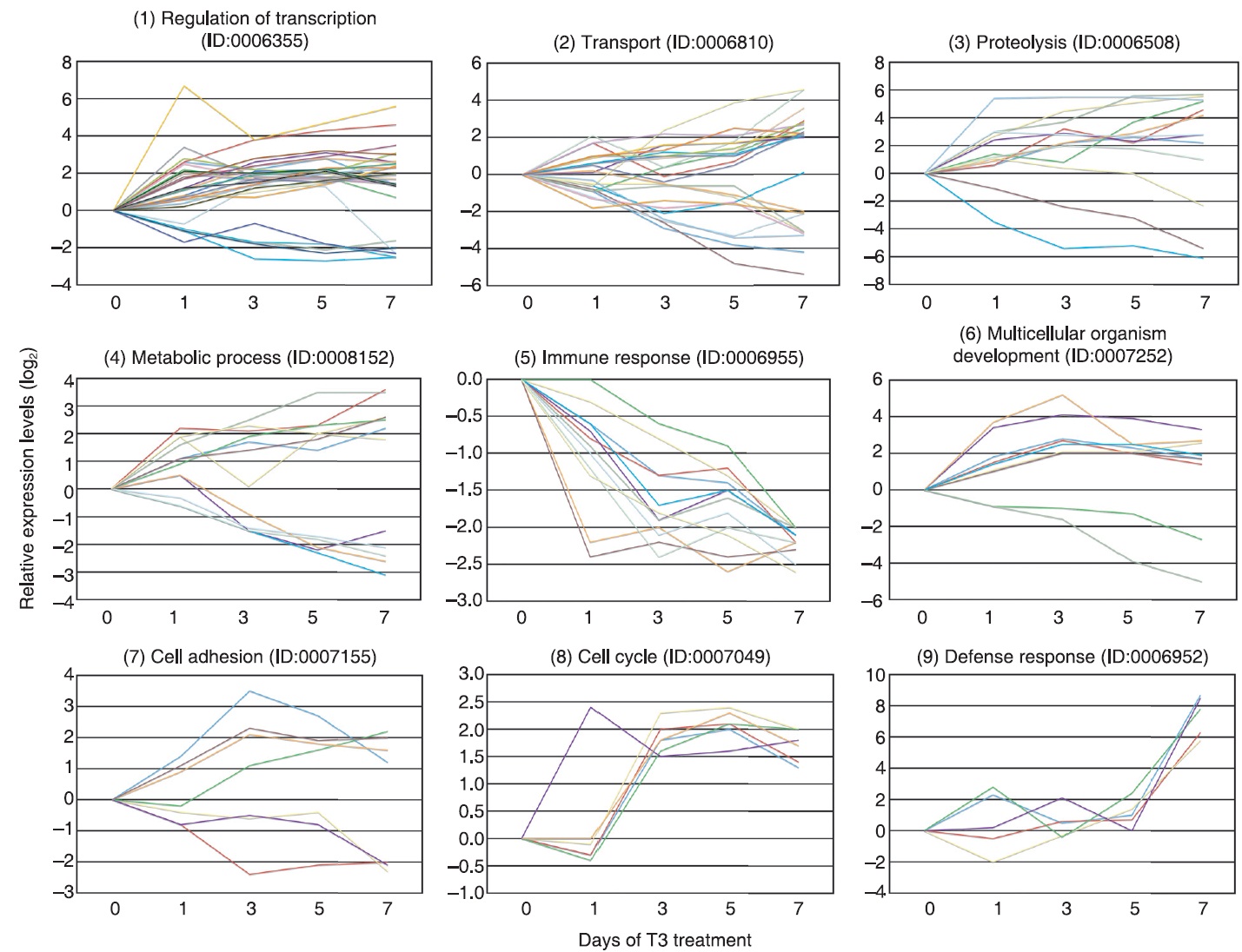 Fig. 3. Expression profiles of the Gene Ontology (GO) annotated genes in body skin during TH-induced metamorphosis. Among the 401