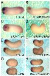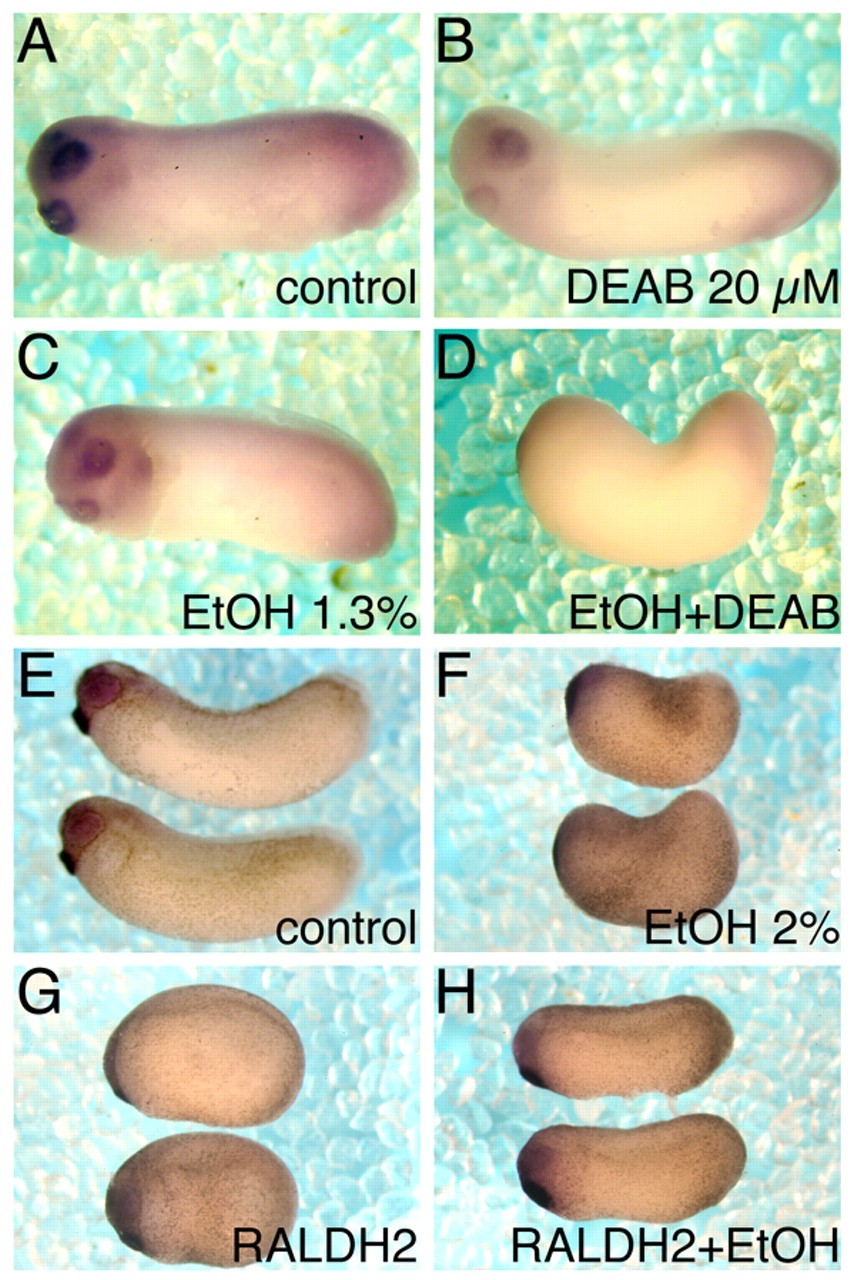 Fig. 2. Manipulation of ALDH activity modulates the EtOH-induced phenotype. Embryos were subjected to different manipulations of ALDH activity in combination with EtOH treatment. Embryos were allowed to develop to early tailbud stages (st. 29) and were analyzed further by in situ hybridization with the XAG1 (cement gland) and Pax6 (eyes and midbrain) probes. (A) Control embryo; at the early tailbud stage, the developing cement gland, eyes and midbrain are clearly discernible as the stained areas to the left of the image. (B) Partial ALDH inhibition with 20 μM DEAB. (C) Low EtOH (1.3%) treatment. (D) Combined EtOH and DEAB treatment. (E) Control embryos. (F) Embryos treated with 2% EtOH. (G) Embryos overexpressing Raldh2. (H) Rescue of the EtOH effect by overexpression of Raldh2.
