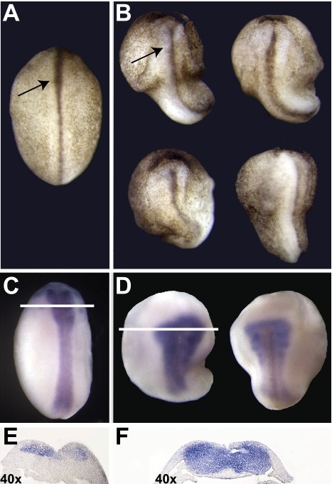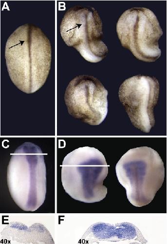 FIGURE 2. Xenopus embryos over-expressing XSMOC-1 exhibit a dorsalized phenotype. A, dorsal views of stage 17 embryos injected bilaterally at the two-cell stage with 300 pg of GFP (A and C) or XSMOC-1 (B and D) mRNAs. XSMOC-1-injected embryos have exaggerated anterior and diminished posterior structures (B) with laterally expanded expression of the neural plate marker Sox2 (D). The arrows indicate the position of the neural tube. E and F, transverse sections taken through the anterior regions of over-stained embryos C and D (white bars) show Sox2 expression throughout the dorsal tissues in XSMOC-1-injected embryos (F). The phenotypes shown for XSMOC-1 over-expression are typical for this stage and were observed in 95% of the embryos in three separate experiments (n = 96).