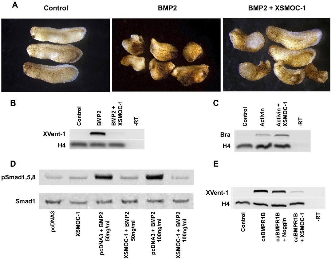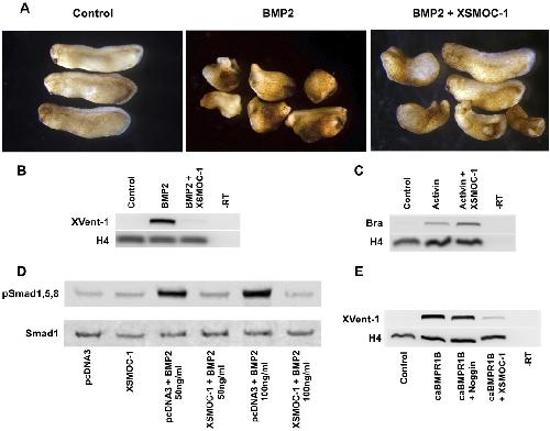 FIGURE 8. XSMOC-1 inhibits BMP2 activity, but not by direct ligand binding. A, embryos were injected bilaterally at the two-cell stage with 360 pg of GFP (control), 60 pg of BMP2 plus 300 pg of GFP, or 60 pg of BMP2 plus 300 pg of XSMOC-1 mRNAs and incubated until stage 26. In three independent experiments, BMP2-injected embryos were ventralized (82% ⤠dorso-anterior index of 1, n = 84), whereas those co-injected with BMP2 and XSMOC-1 showed partial to complete rescue (70% ⥠dorso-anterior index of 3 or greater, n =98). B and C, RT-PCR analysis of animal cap explants removed from embryos at stage 8 and cultured until sibling embryos reached stage 17. B, RT-PCR for the ventral marker XVent-1 was induced in caps over-expressing BMP2 but not in control injected caps or caps co-expressing BMP2 and XSMOC-1. C, RT-PCR analysis of animal cap explants removed from embryos injected bilaterally at the two-cell stage with 400 pg of GFP (control), 100 pg of activin plus 300 pg of GFP, or 100 pg of activin plus 300 pg of XSMOC-1 mRNAs incubated until stage 17. Expression of the mesodermal marker Brachyury (Bra), induced in caps overexpressing activin, was not inhibited by co-expression of XSMOC-1. D, immunoblot analysis of mouse 3T3 fibroblast cell lysates. 3T3 fibroblasts were transfected with or without XSMOC-1 and exposed to BMP2 for 1 h. Phosphorylation of Smad1, -5, and -8 by BMP2 was blocked in cells transfected with XSMOC-1. E, RT-PCR analysis of animal cap explants removed from embryos injected bilaterally at the two-cell stage with 450 pg of GFP (control), 150 pg of caBMPR1B plus 300 pg of GFP, or 150 pg of caBMPR1B plus 300 pg of XSMOC-1 mRNAs were incubated until stage 17. The expression of the ventral marker XVent-1, induced by over-expression of constitutively active BMP receptor IB (caBMPR1B), was blocked by co-expression with XSMOC-1 but not by noggin. -RT, without reverse transcriptase.