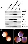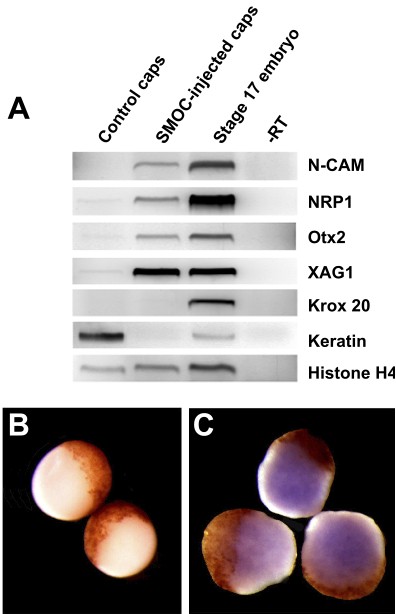 FIGURE 4. XSMOC-1 induces neural markers in animal cap explants and acts non-cell-autonomously. A, RT-PCR analysis of animal caps obtained from embryos injected bilaterally with 300 pg of GFP (control) or XSMOC-1 at the two-cell stage. Animal caps were removed from stage 8 embryos and cultured until noninjected siblings reached stage 17. XSMOC-1 induced the neural markers N-CAM, NRP1, Otx2, and XAG1 and suppressed the expression of the epidermal marker, keratin. mRNA extracted from whole embryos (lane 3) was used as a positive control for the RT-PCRs, and reactions from which reverse transcriptase was omitted (ï°RT; lane 4) were the negative con- trols. B and C, whole mount hybridization in situ of Otx2 in albino animal caps conjugated to wild-type caps. Wild-type embryos were injected bilaterally with 300 pg of GFP (B) or XSMOC1 (C). Animal caps were removed at stage 8 and conjugated to caps removed from stage 8 nonin- jected albino embryos. The conjugates were cultured until sibling embryos reached stage 17. Otx2 staining was not observed in the GFP control cap conjugates (B) but was present in the noninjected albino caps conjugated to XSMOC1-injected wild-type caps (C).