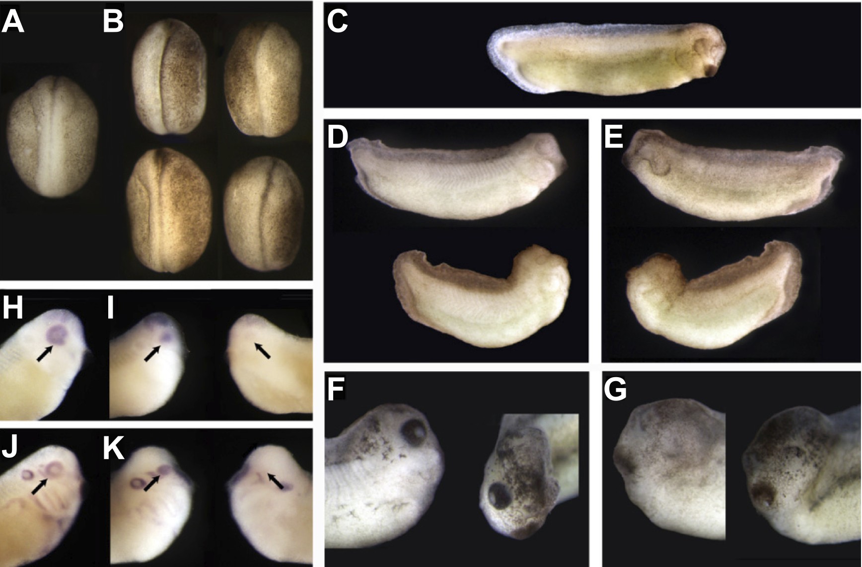 FIGURE 5. Unilateral injection of XSMOC-1 antisense morpholino (MO) produces mild ventralization and anophthalmia on the injected side. XSMOC-1 MO (6 ng) was injected into a single blastomere at the two-cell stage. At stage 17 (A and B), mild abnormalities were observed in the developing neural axis of XSMOC-1 MO-injected embryos (B). By stage 32 (C), MO-injected embryos were mildly ventralized (D and E) compared with controls (C). In addition, eyes were absent on the injected side (E); this was more apparent by stage 38 (G). Eye development appeared normal on the noninjected side (F). The XSMOC-1 MO phenotypes shown in D and E were typical for this stage and were observed in 90% of the embryos in five independent experiments (n=164). H, whole mount hybridization in situ analyses of Otx2 (H and I) and Tbx2 (J and K) in stage 32 control (G and J) and XSMOC-1 MO-injected (I and K) embryos. The injected sides are displayed on the right. The arrows indicate the location of the eye fields.