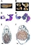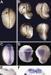 FIGURE 3. Dorsalization is pronounced in tadpoles overexpressing XSMOC-1. A, stage 26 Xenopus embryos injected bilaterally at the two-cell stage with 300 pg of GFP (A, C, and E) or XSMOC-1 mRNAs (B, D, and F). XSMOC-1-injected embryos were dorsalized, with exaggerated dorsal/anterior structures, particularly cement glands. The XSMOC-1 overexpression phenotypes shown in B were typical for this stage and were observed in 95% of the embryos in five independent experiments (n=218). C and D, histological 3-mm plastic sections (modified Von Gieson stain) showing hypertrophic cement gland cells in XSMOC-1-overexpressing embryos (D). E and F, 7-mm paraffin sections (Feulgen, light green, orange G method) showing enlargement of the neural tube and disorganized somites in XSMOC-1 over-expressing embryos (F).