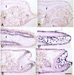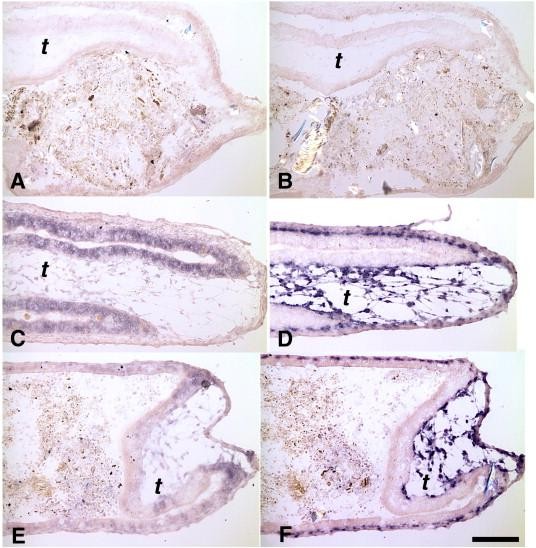 Fig. 4. The IFABP-TRDN-GFP transgene specifically inhibits TH direct-response genes in the epithelium, but not in the mesenchyme. Cross sections of duodenums from (A, B) wild-type NF54 tadpoles treated with either 0 nM T3; (C, D) 5 nM T3 for 48 h. Cross sections of duodenums from (E, F) sibling tadpoles transgenic for IFABP-TRDN-GFP treated with 5 nM T3 for 48 h. (A, C, E) Expression of the TH direct-response gene, bZip, mRNA in the epithelium. (B, D, F) Expression of the TH direct-response gene, stromelysin-3 (ST3), mRNA in the mesenchyme. mRNA localized by in situ hybridization (purple stain). Scale bar in F denotes 0.2 mm length.