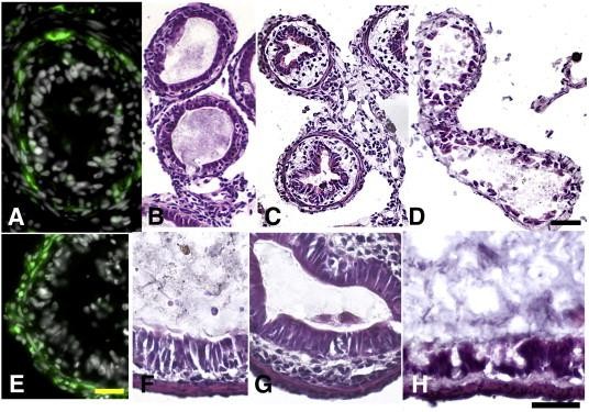 Fig. 7. Both The ST3-TRDN-GFP and Col-TRDN-GFP transgenes inhibit epithelial development and thickening of the sub-epithelial mesenchyme. (A) GFP is expressed specifically in the intestinal mesenchyme of tadpoles transgenic for ST3-GFP in an NF48 tadpole induced with T3 (10 nM) for 48 h. (B) Cross sections of the intestine from an untreated NF48 wild-type tadpole; (C) an NF48 wild-type tadpole treated for 7 days with 5 nM T; (D) an NF48 tadpole transgenic for ST3-TRDN-GFP treated for 7 days with 5 nM T3. (E) GFP is expressed in the mesenchyme and smooth muscle layers (but not in the epithelium) of an NF48 tadpole transgenic for Col-GFP. Cross sections of intestine from (F) an untreated NF54 wild-type tadpole; (G) an NF54 wild-type tadpole treated for 7 days with 5 nM T3; (H) an NF54 tadpole transgenic for Col-TRDN-GFP treated for 7 days with 5 nM T3. Immunoreactivity against GFP in A and E is green, and nuclei are counterstained white with dapi. Tissues in BâD and FâH are stained with hematoxylin and eosin. Scale bar in E denotes 20 μm length; scale bars in D and H denote 50 μm length.
