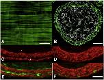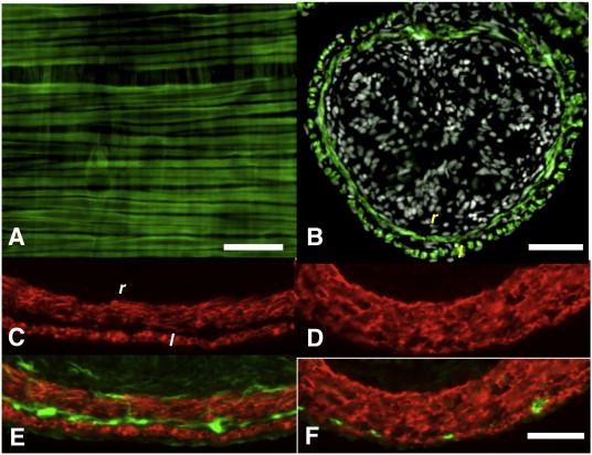 Fig. 8. The pCar-TRDN-GFP transgene inhibits smooth muscle separation, thickening of the inter-muscular mesenchyme, and aggregation of enteric neurons. (A) The whole-mounted duodenum of an NF57 tadpole transgenic for pCar-GFP expresses GFP (green) specifically in the longitudinal (oriented leftâright) and circular (oriented topâbottom) muscle fibers. Cross sections from the duodenum of (B) NF63 tadpole transgenic for pCar-GFP stained for immunoreactivity against GFP (green) and counterstained for nuclei with dapi (white); (C, D) stained with smooth muscle actin antibody; (E, F) stained with smooth muscle actin and neural beta-tubulin antibodies. (C, E) Control NF63 tadpole; (D, F) NF63 tadpole transgenic for pCar-TRDN-GFP. Circular (c) and longitudinal (l) smooth muscle fibers. Scale bar in A denotes 20 μm length; scale bar in B denotes 100 μm length; scale bar in F denotes 40 μm length.