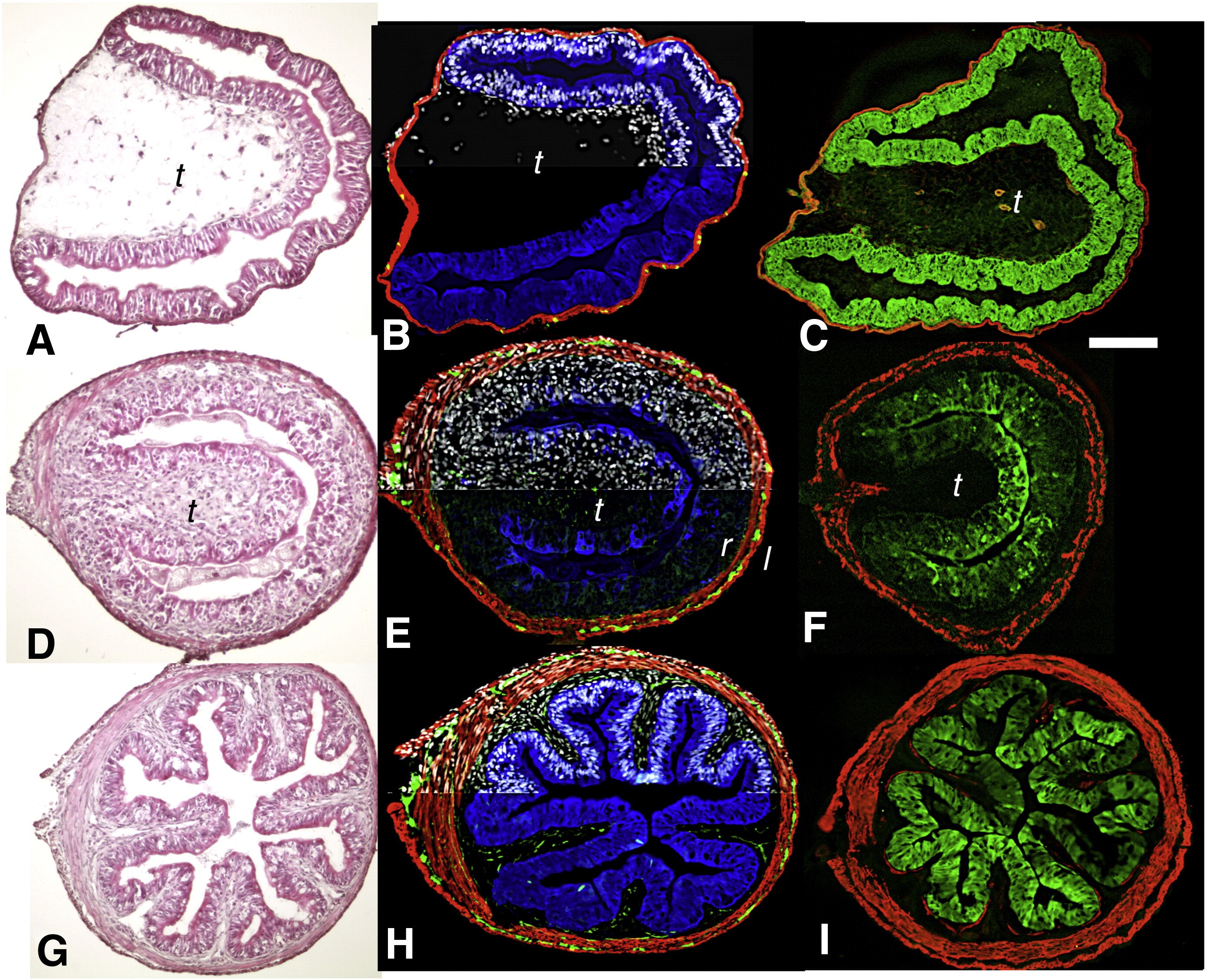 Fig. 1. Virtually every tissue is affected during spontaneous metamorphic remodeling of the duodenum. Cross sections of the duodenum from (AâC) wild-type prometamorphic tadpoles NF57; (DâF), metamorphic climax NF61; (GâI), and the end of metamorphosis NF66. (C, F, and I) Cross sections of the duodenum from tadpoles transgenic for IFABP-GFP. The GFP antibody reaction is green; smooth muscle actin antibody is red. (A, D, and G) Hematoxylin and eosin. (B, E and H) Immunoreactivity against endogenous intestinal fatty acid binding protein (IFABP; blue), muscle-specific smooth muscle actin (red), enteric neuron-specific neural beta-tubulin (green); and a nuclear counter-stain (dapi; white) is shown for half of each section. t = typhlosole, c = circular muscle, l = longitudinal muscle. Scale bar in C denotes 0.2 mm length.