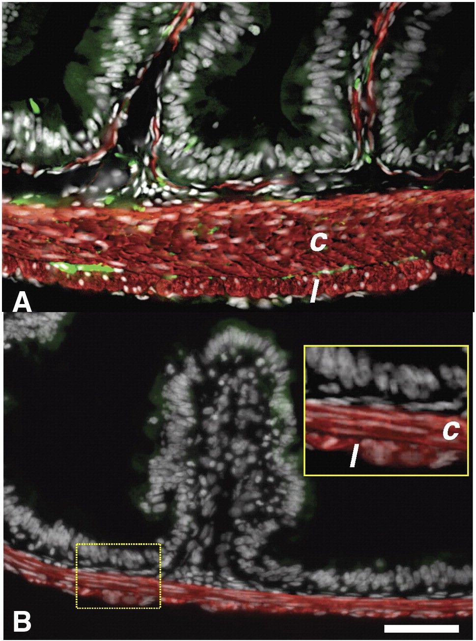Fig. 6. The IFABP-TRDN-GFP transgene inhibits circular muscle thickening and aggregation of enteric neurons. (A) Duodenal cross sections from a wild-type NF66+ froglet; (B), from a transgenic froglet. Tissues were stained for immunoreactivity against smooth muscle actin (red) and neural beta-tubulin (green). Sections are counterstained for nuclei with dapi (white). Circular muscle fibers (c); longitudinal muscle fibers (l). Inset in B is a magnification of the region encompassed by the dashed yellow rectangle. Scale bar denotes 0.1 mm length.