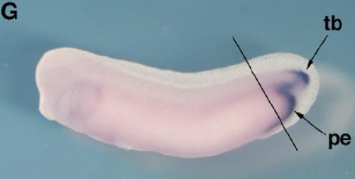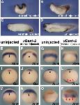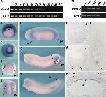 Conserved expression of Xenopus Best-2 gene in the organizer and blastopore lip. (A) Temporal expression of X. laevis Best-2 gene. RNA was extracted from X. laevis embryos at the stages indicated above each lane. egg, unfertilized egg; RT-, RT-PCR without reverse transcriptase. (BâJ) Spatial expression of X. laevis Best-2 analyzed by in situ hybridization. (B) Stage 10.5 embryo in vegetal view. Arrowhead indicates the blastopore. The line represents the position of the section shown in (I). (C) Stage 12 embryo in vegetal view. The line represents the position of the section shown in (J). (D) Stage 15 embryo in dorsal view. The line represents the position of the section shown in (K). (E) Stage 20 embryo in dorsal view. (F) Stage 25 embryo. (G) Stage 30 embryo. The line represents the position of the section shown in (L). (H) Stage 35 embryo. (I) Sagittal section of a stage 10.5 embryo. The arrowhead indicates the blastopore. (J) Sagittal section of a stage 12 embryo. Arrowheads indicate the edge of the yolk plug. (K) Transverse section of a stage 15 embryo. (L) Transverse section of a stage 30 embryo. nc, neural crest; ae, anterior endoderm; pe, posterior endoderm; tb, tailbud; ar, archenteron roof; ca, cloaca. (M) xBest-2 is induced by nodal signaling. Animal caps were dissected from embryos injected with 20 pg of Xnr5 RNA or 500 pg of VegT RNA, and cultured until stage 20 for RT-PCR. Both Xnr5 and VegT induced expression of xBest-2. un, uninjected animal caps as a negative control; WE, whole embryo as a positive control; RT-, reverse transcriptase minus as a negative control.