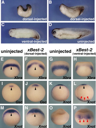 Overexpression of xBest-2 causes gastrulation defect and interferes with the expression of mesendoderm genes. (A–C) Embryos were injected with 1 ng of xBest-2 RNA into the dorsal side (A, B) or the ventral side (C) at the 4-cell stage, and photographed at stage 35. (D) Uninjected control embryo at stage 35. (E–P) Embryos were injected with 1 ng of xBest-2 RNA into two dorsal (E, F, I, J, M, N) or two ventral (G, H, K, L, O, P) blastomeres at the 4-cell stage, and fixed at stage 10.5 for in situ hybridization analysis. Embryos are in dorsal view (E, F, M, N), ventral view (G, H, O, P), and vegetal view (I, J, K, L). (E–H) In situ hybridization of Xbra. (I, J) In situ hybridization of goosecoid (gsc). (K–P) In situ hybridization of Xnot. Black arrowheads indicate the blastopore lip. Red arrowheads indicate ectopic expression of Xnot.
