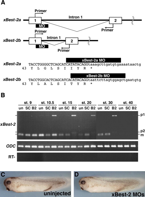Loss-of-function study of xBest-2. (A) Genomic structures including exon 1 (1) and exon 2 (2) of xBest-2a and xBest-2b. The translation initiation codon (ATG) and primer regions are indicated (Primer). The splice-site-targeted antisense morpholino oligonucleotides, xBest-2a MO and xBest-2b MO, were designed against the sequence at the boundary of exon 1/intron 1 of each gene. xBest-2a and xBest-2b intron 1 have different lengths. The pre-mRNAs of xBest-2a and xBest-2b generated by splice blocking have a termination codon immediately following exon 1. The intron 1 sequences are in lower case. Amino acid sequences are also indicated. (B) RT-PCR analysis of xBest-2 mRNA in MO-injected embryos. Embryos were injected with 20 ng of xBest-2a MO plus 20 ng of xBest-2b MO (B2), or 40 ng of standard control MO (SC), in the marginal region of both blastomeres at the 2-cell stage, and cultured for RT-PCR until various stages as indicated above each lane. The primer set was designed to span the first intron to detect splicing of the endogenous pre-mRNA for both xBest-2a and xBest-2b (corresponding to Primer in (A)). In xBest-2 MO-injected embryos, the mature mRNA (m) was decreased and nonspliced pre-mRNA (p1 and p2) was detected from stage 10.5. The mature xBest-2 mRNA was eliminated at stage 30 in xBest-2 MO-injected embryos. Splicing of xBest-2 pre-mRNA was not affected by control MO injection. (C) A control uninjected embryo at stage 35 (uninjected). (D) An embryo injected with 20 ng of xBest-2a MO plus 20 ng of xBest-2b MO (xBest-2 MOs). Disruption of xBest-2 did not affect the patterning of embryos at stage 35.
