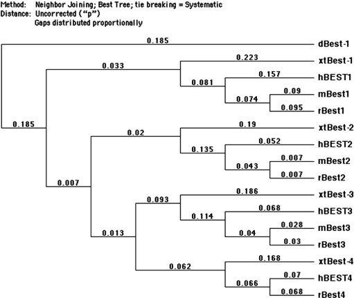 Phylogenetic tree of Bestrophin proteins. Multiple protein sequence alignments were performed using MacVector software (MacVector Inc). The following sequences were used: hBEST1 (NM_004183), hBEST2 (NM_017682), hBEST3 (NM_032735), hBEST4 (NM_153274), mBest1 (NM_011913), mBest2 (NM_145388), mBest3 (NM_001007583), rBest1 (NM_001011940), rBest2 (NM_001108895), rBest3 (XM_235161), rBest4 (XM_001067201), xtBest-1 (AB495092), xtBest-2 (NM_203643), xtBest-3 (AB495093), xtBest-4 (NM_001123442), and dBest-1 (AAR99659). hBEST, human BEST. mBest, mouse Best. rBest, rat Best. dBest-1, Drosophila Bestrophin-1.
