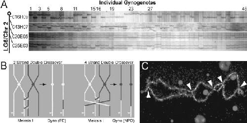Figure 4. Interference in X. tropicalis. A: Individual gynogenotes (48 lanes total) scored with four markers from the q arm of Chr2/LG6 with centromere-proximal marker (top) to distal (bottom) (016H09, LG6 map position 0.00 cM, 043H07/2.72 cM, 020E05/27.46 cM, and 025E03/44.7cM). Crossovers can be detected by changes between homo- and heterozygosity within a lane; embryos 3, 8, 11, 15, 16, 19, and 27 show more than one crossover between the centromere and the most distal marker. Heterozygosity in the most proximal marker in lanes 8 and 19 reflects a crossover between the centromere and that marker. Lanes 5 and 23 do not display crossovers. B: Some species of double crossover uncouple linkage of distal loci to centromere markers. In the âtwo-strand double crossoverâ (left), a distal recessive mutant locus (asterisks) remains linked to the white parental centromere allele after two intervening crossovers (parental ditype, PD). In the âfour-strand double crossoverâ (right), mutant gynogenote shows dark nonparental ditype (NPD) centromeric alleles. C: Multiple chiasmata (white arrowheads) in a 4â²,6-diamidine-2-phenylidole-dihydrochloride (DAPI) -stained lampbrush preparation of Chromosome 1.Download figure to PowerPoint
