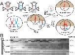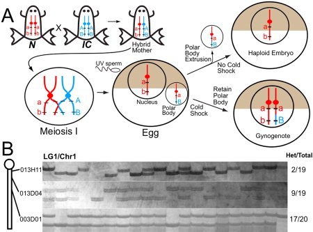 Figure 1. Gynogenesis and centromere mapping. A:X. tropicalis N and IC strains differ at many sequence polymorphisms, schematized in red and blue. Hybrids contain both N and IC parental chromosomes, which recombine during meiosis I. Shortly after fertilization, one set of sister chromatids is extruded as a polar body, resulting in a haploid embryo if eggs are fertilized with ultraviolet-irradiated sperm. Cold shock suppresses polar body formation, resulting in a gynogenote containing the sister chromatids of meiosis II. Loci very close to centromeres are homozygous in gynogenotes, but meiotic recombination can produce heterozygous noncentromeric loci. B: Centromeres were mapped by assaying frequency of homozygosity at polymorphic loci in gynogenotes. Three markers on Chr 1/LG1 were tested on the same set of gynogenotes. Proximity to centromere is reflected by relative frequency of heterozygosity, with marker 013H11 (2/19) closer than 013D04 (9/19) and 003D01 (17/20).Download figure to PowerPoint