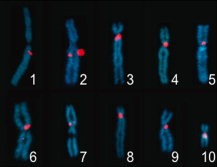 Figure 2. Cytological localization of centromeric markers. Fluorescence in situ hybridization (FISH) probes were generated from cDNAs of genes on centromere-linked scaffolds identified by gynogenesis. Probe name, location: Chr1/LG1: mast3, q0.13; Chr2/LG6: epb41, q0.22; Chr3/LG8: gemin5, p0.00; Chr4/LG7: znf423, p0.00; Chr5/LG9: olig3, p0.00; Chr6/LG2: fbxl7, q0.13; Chr7/LG4: mat1a, p0.12; Chr8/LG5: naif1, p0.00; Chr9/LG3: stat4, q0.09; Chr10/LG10: ezh1, q0.03.Download figure to PowerPoint