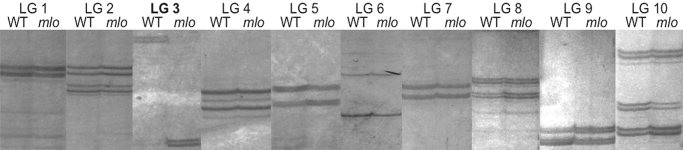 Figure 3. Mapping mutations with centromere markers and gynogenesis. Bulk segregant analysis of pools of 20 mrs lot mutant (mlo) and sibling wild-type (WT) gynogenotes scored with centromeric markers (LG1 013H11, LG2 025H10, LG3 025G03, LG4 010E04, LG5 049C11, LG6 016H09, LG7 047F06, LG8 051H02, LG9 026H07, LG10 028C03) from the 10 X. tropicalis linkage groups. mrs lot shows clear linkage to LG3.Download figure to PowerPoint