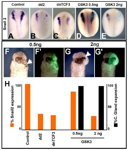 Fig. 4. NC and cement gland have different sensitivity to Wnt inhibition. Embryos were injected at the eight-cell stage embryo with the indicated mRNA, fixed between stages 16-18 when the expression of Snail2 was analysed. Right side of the embryo corresponds to the injected side. (A) Control embryo. (B) Embryo injected with 1 ng of dd2 mRNA. (C) Embryo injected with 0.6 ng of dnTCF3. (D) Embryo injected with 0.5 ng of GSK3 mRNA. (E) Embryo injected with 2 ng of GSK3 mRNA. (F) Embryo injected with 0.5 ng GSK3 mRNA showing cement gland expansion (arrowhead); (Fâ²) fluorescence overlay showing site of injection. (G) Embryo injected with 2 ng GSK3 showing cement gland expansion (arrow); (Gâ²) fluorescence overlay showing site of injection. (H) Summary of the results in whole embryos. Each experiment was repeated at least three times.