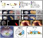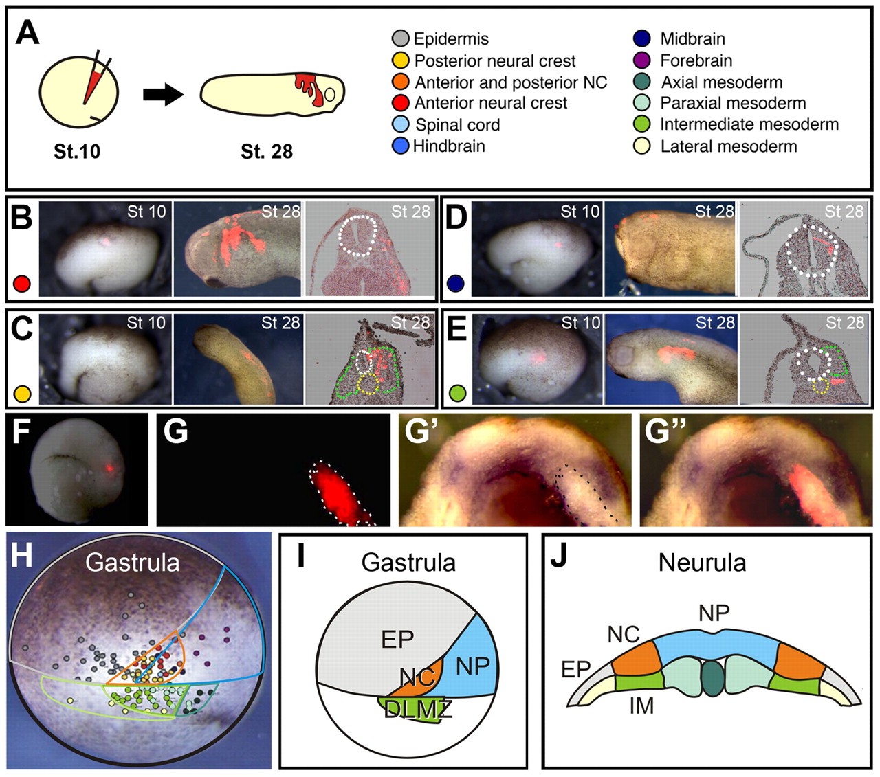 Fig. 1. NC fate map. (A) Stage 10 embryos were injected with small quantities of the lipophilic marker DiI to label prospective neural crest cells and the surrounding tissues. (B-E) Representative examples of the labelled cells contributing to the cephalic NC (B), trunk NC (C), midbrain (D) and posterior intermediate mesoderm (E). Broken lines outline the neural tube (white), notochord (yellow) and somites (green). (F,G) DLMZ becomes IM and underlies the NC. (F) DiI was used to label the DLMZ of a stage 10 embryo. At the neurula stage (stage 16), the embryos were fixed and in situ hybridisation against Snail2 was performed. (G) Section showing fluorescence in the IM. (Gâ²) Same section as in G showing Snail2 expression (Gâ²) Merge of G and Gâ². (H) The position of each labelled cell was mapped onto a photo of a stage 10 embryo. Each colour corresponds to the key shown in A. (I) A summary of fate map at stage gastrula stage. (J) Summary of the position of NC in relation to IM at the neurula stage.